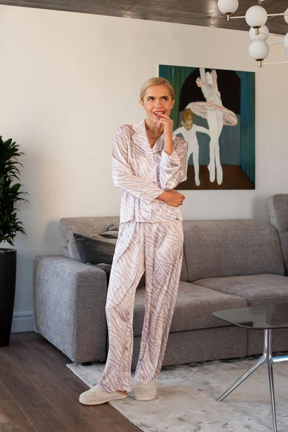 Комплект шелковая сатиновая пижама двойка брюки + рубашка Пудра L
