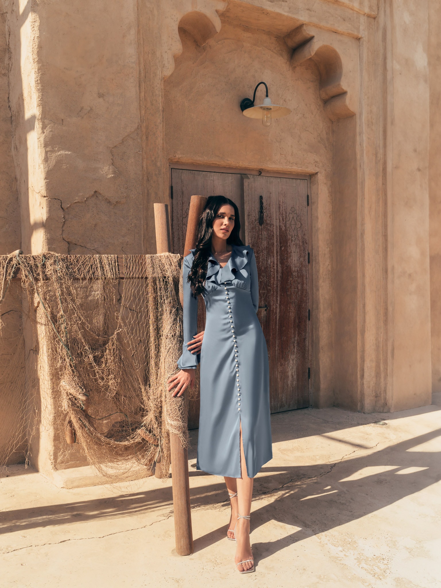 Атласное платье миди с воланами на воротнике и жемчужными пуговицами